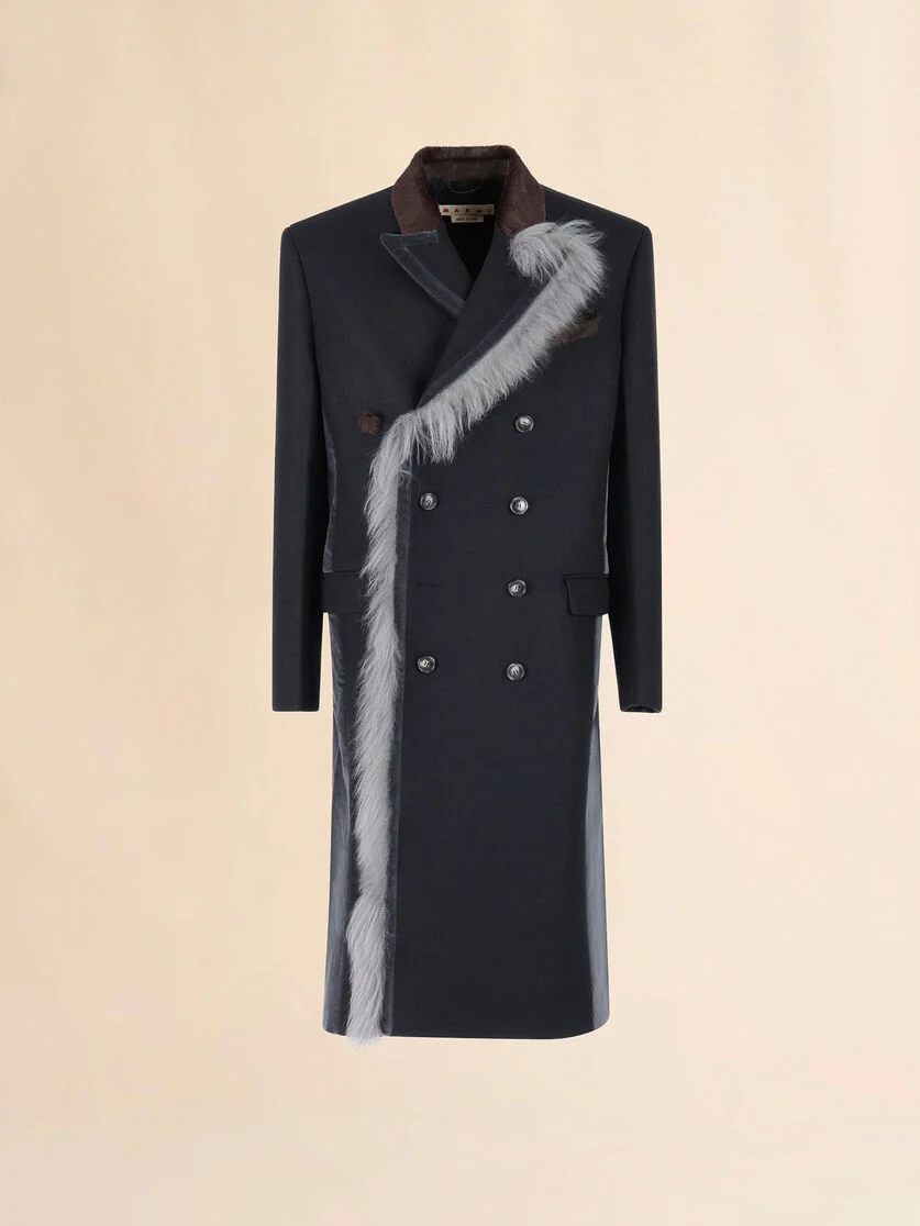 Double-breasted coat crafted from double-splittable wool felt. Regular fit with six-button fastening, welt chest pocket and two flap pockets. Detailed with pony hair accents and fur trim. Features new Marni Mending on the left sleeve cuff. Fully lined. Made in Italy MODEL TUMU0144QSUTW96700N99