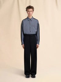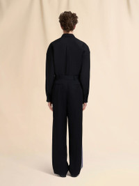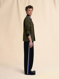 Tailored trousers made from Batavia wool with a compact feel and crepe-like texture. Colour-blocked with two-tone blue and white side bands. Wide-leg cut with mid rise and voluminous front pleats. Back pockets, one with a button. Zipper and hook closure. Made in Italy MODEL PUMU0311Q0UTWA3200N99 FIT The model is 6' 2". The model is wearing size 48 IT. COMPOSITION Primary Fabric: 100% Virgin Wool Woven - Secondary Fabric: 100% Virgin Wool Woven - Third Fabric: 100% Virgin Wool Woven - Pocket Lining: 100% Cotton Woven