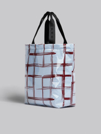Upcycled checked drill North/South tote bag with embroidered satin patch, wrapped in clear TPU. Inside snap button pocket, embellished with a rubber Marni patch. Lined in cotton canvas. DETAILS COMPOSITION Body: 100% Polyurethane - Contrast: 77% Cotton 23% Linen - Lining: 100% Cotton - Application: 100% Polyester