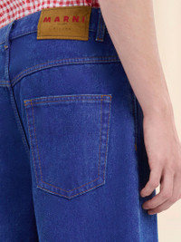Bleached organic denim 5-pocket trousers. Relaxed fit with low waist. Raw cut hem and matching red ribbon belt. Zip and tack button closure. Leather label with red Marni logo at the back of the waist. Made in Italy MODEL PUJU0019A1USCU83BDB60 FIT The model is 6' 2". The model is wearing size 32 IT. COMPOSITION 100% CO1