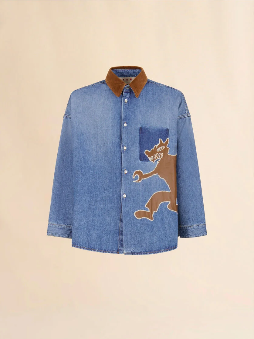 Long-sleeved shirt made from washed bull denim. Oversized fit with a contrast velvet collar and button fastening. Features a wolf patch on the front created in collaboration with the artists Slawn and Soldier. Made in Italy MODEL CUJU0061QSUSCY4400B96