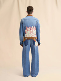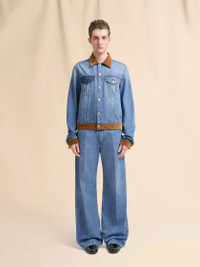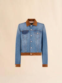 Trucker jacket made from washed bull denim. Designed with a contrast velvet trim and vertical welt side pockets. Regular fit with front button fastening. Features an oversize patch on the back, created in collaboration with the artists Slawn and Soldier. Fully lined. Made in Italy MODEL JUJU0020QSUSCY4400B96