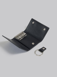 Key holder crafted from milled calfskin leather. Trifold design, opening to reveal palladium metal hooks and a detachable keyring. Snap button closure Hand-stitched Marni Mending logo with flower detail. Made in Italy MODEL PCMI0017U2P653300B56 COMPOSITION Body: 100% Calf Leather - Contrast: 100% Polyester - Lining: 100% Viscose-Rayon - Inside: 100% Ovine Leather - Metallic Parts: 100% Steel - Metallic Parts: 100% Brass
