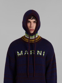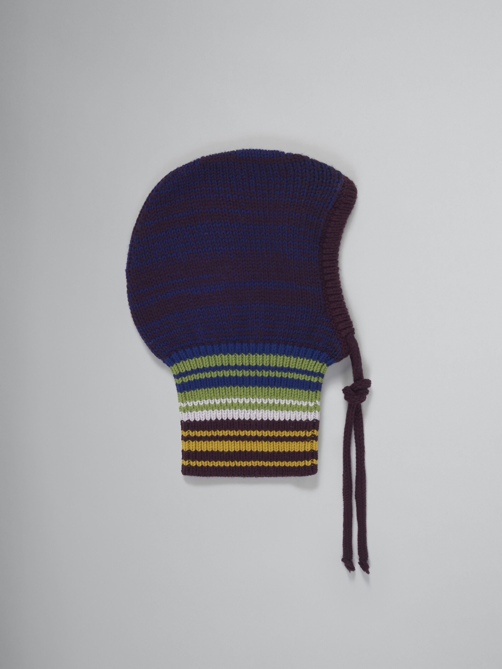 Balaclava knitted from twisted mouliné virgin wool. Detailed with a striped neck. Ribbed opening and front drawstrings. Made in Italy. DETAILS COMPOSITION Primary Fabric: 100% Virgin Wool Knit