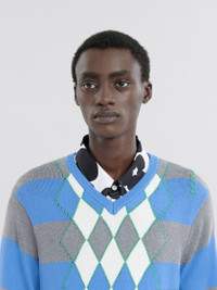 Cotton V-neck striped jumper embellished with a contrasting Argyle motif inlaid on the front. Regular fit with long sleeves and ribbed trims. Finished with a hand embroidered Marni Symbol on the shoulder. The main fiber in this garment is made using at least 50% of highly selected organic cotton, grown using farming practices that support biodiversity and healthy ecosystems. Made in Italy MODEL CVMG0133Q2UFC657ARB52 FIT The model is 6' 1". The model is wearing size 48 IT. COMPOSITION Primary Fabric: 100% Cotton Knit - Secondary Fabric: 100% Cotton Knit - Third Fabric: 100% Cotton Knit