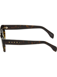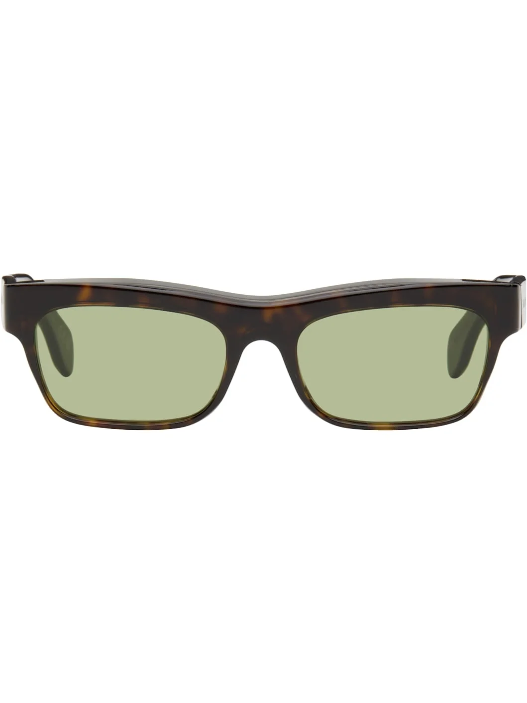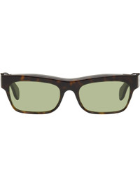 Handcrafted rectangular tortoiseshell acetate-frame sunglasses in brown. · Green lenses · 100% UV protection, category 2 · Integrated nose pads · Logo etched at temples · Includes pouch · Size: 55.19 145 Supplier color: 3627 Acetate. Made in Italy 252379M134024