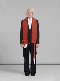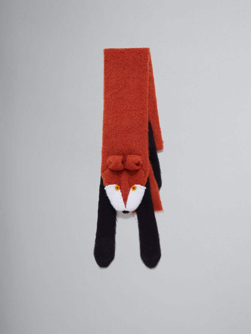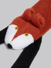 Novelty puppet scarf knitted from brushed mohair. Fox head on one end with button eyes, 3D ears and black paws. Tail on the other end. DETAILS COMPOSITION Primary Fabric: 40% Acrylic 34% Polyamide-Nylon 26% Mohair
