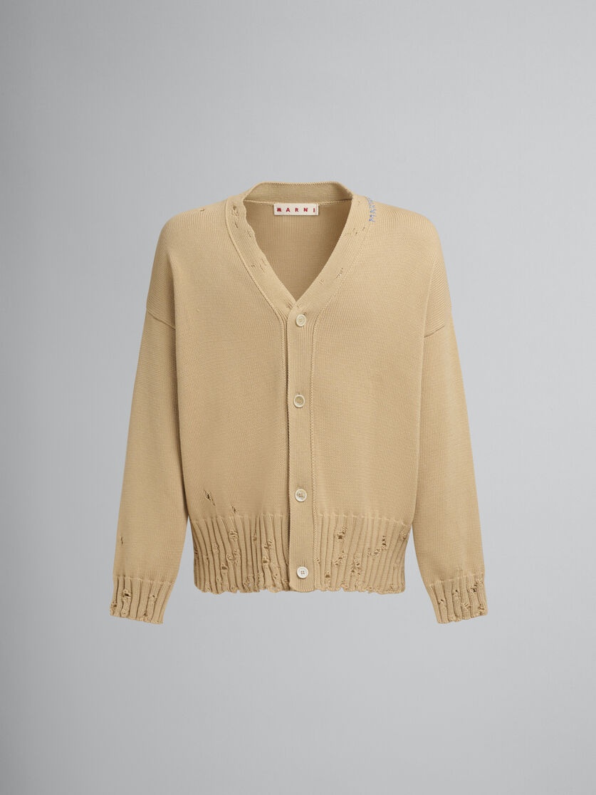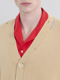 Regular fit V-neck cotton cardigan with drop shoulder. Button up front and Marni Symbol hand embroidered on the front. The main fiber in this garment is made using at least 50% of highly selected organic cotton, grown using farming practices that support biodiversity and healthy ecosystems. Made in Italy MODEL CDMG0136A0UFC65200W26 FIT The model is 6' 2". The model is wearing size 48 IT. COMPOSITION Primary Fabric: 100% Cotton Knit