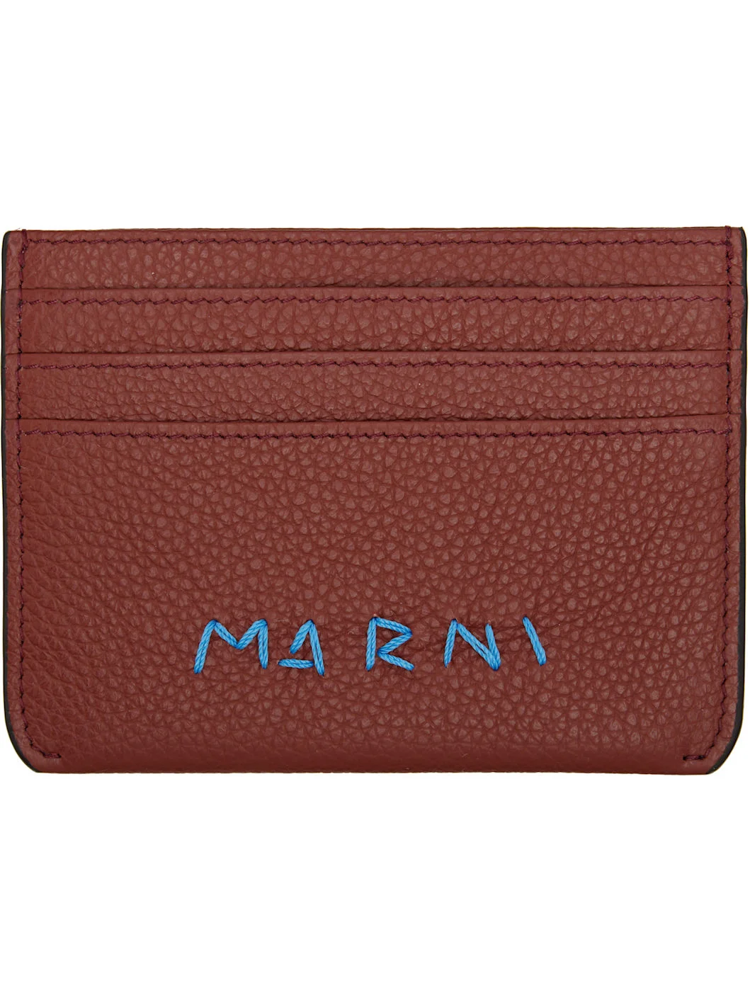 Grained calfskin card holder. · Hand-stitched logo at face · Six card slots · Central note slot · H3.25" x W4.25" Supplier color: Wild cherry Calfskin. Made in Italy 252379M163001