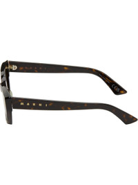 Handcrafted rectangular tortoiseshell acetate-frame sunglasses in brown. · Green lenses · 100% UV protection, category 2 · Integrated nose pads · Logo etched at temples · Includes pouch · Size: 53.21 145 Supplier color: 3627 Acetate. Made in Italy 252379M134020