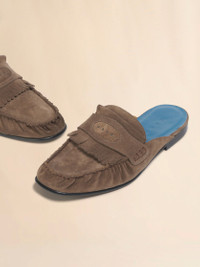 BROWN SUEDE SABOT WITH FRINGE TRIM