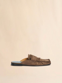 Soft deconstructed sabot made from supple suede. Hand-stitched seams and fringe trim with embossed Marni logo. Finished with a contrast insole and supple leather sole. MODEL SBMR007701P902600M70