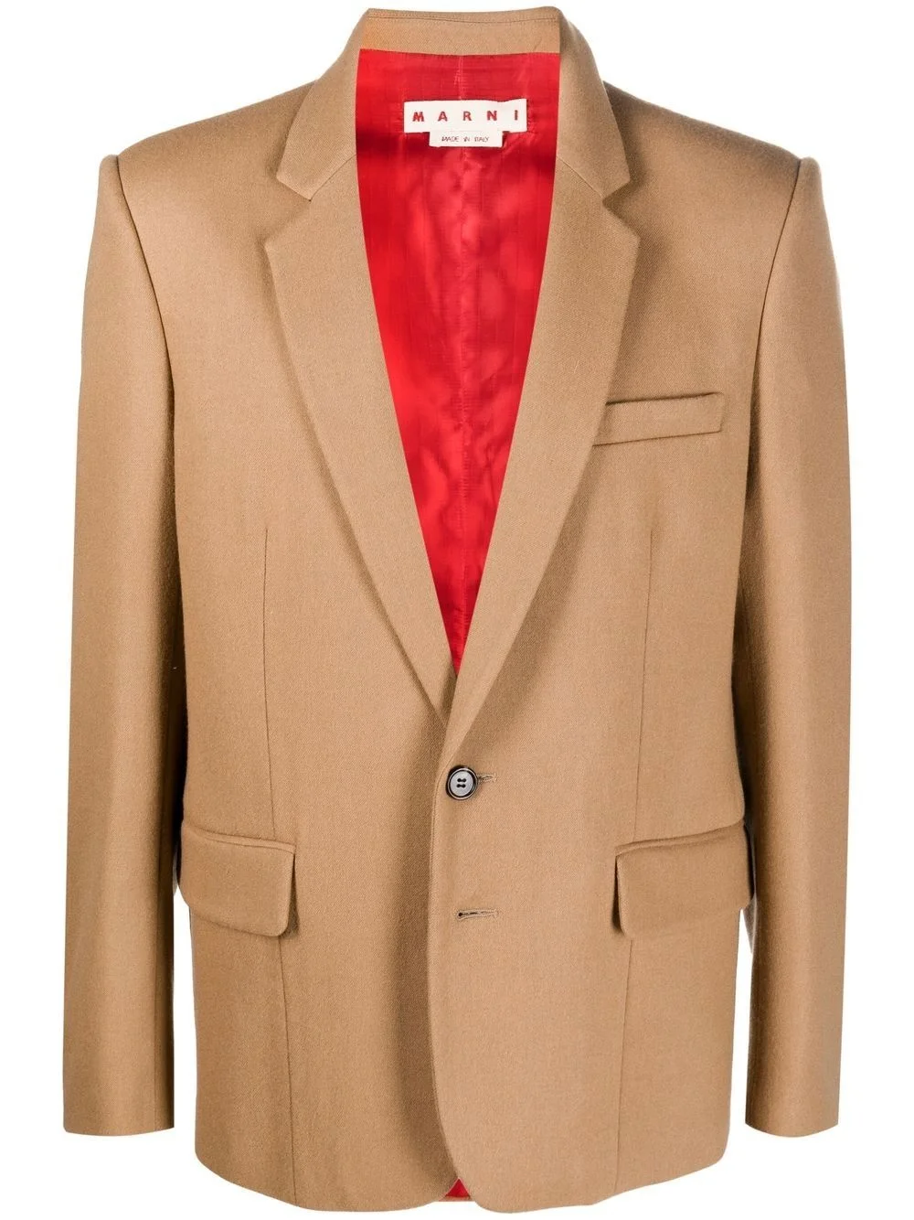 buttoned single-breasted blazer earth brown virgin wool blend raw-cut finish rear button fastening button fastening at the sleeve front button fastening notched lapels chest welt pocket two front flap pockets long sleeves straight hem Made in Italy Composition Outer: Virgin Wool 87%, Polyamide 11%, Elastane 2% Lining: Cotton 100% SIZE & FIT Model measurements Height 6 ft 0 in(1.84 m) Bust/Chest 35.82 in(91 cm) Hips 37 in(94 cm) Waist 28.34 in(72 cm) FittingInformation This piece fits true to size. We recommend you get your regular size Cut for a loose fit Made with a mid-weight fabric