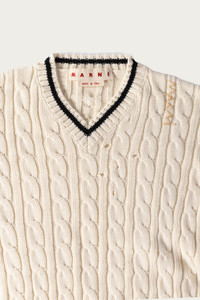 Expertly hand knit with a v-neck design, this Disheveled Cotton 5G sweater features a unique distressed look and an embroidered logo on the shoulder. Feel the softness of natural white cotton while making a subtle style statement. A must-have for any fashion enthusiast.