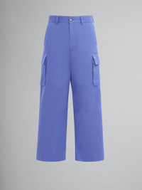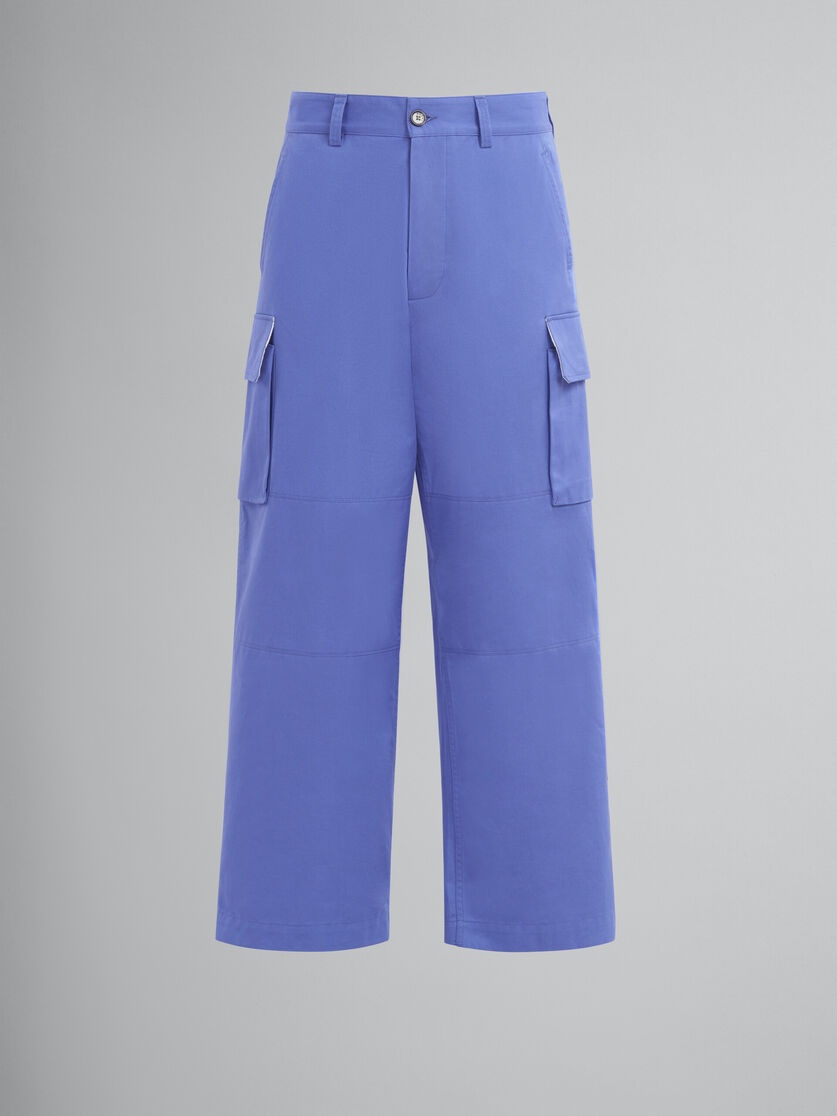 Organic cotton gabardine cargo trouser. Relaxed fit. Side welt pockets, patch pockets with flap on the legs and pockets with flap and button on the back. Straight leg with adjustable straps at the ankle. Zip and horn button closure. Made in Italy MODEL PUMU0169A1UTC31100B26 FIT The model is 6' 2". The model is wearing size 48 IT. COMPOSITION Primary Fabric: 100% Cotton Woven - Pocket Lining: 100% Cotton