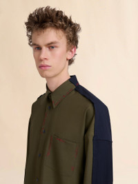 Long-sleeve shirt made of tropical wool. Half-and-half patchwork style, featuring a longer contrast back with raw-cut edges. Boxy fit with button closure and chest pocket. Handcrafted Marni Symbol embroidery and stitches on the front. MODEL CUMU0278QSTW83900V58