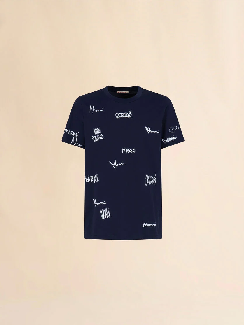 DEEP BLUE COTTON T-SHIRT WITH MULTIGRAM MARNI PRINT