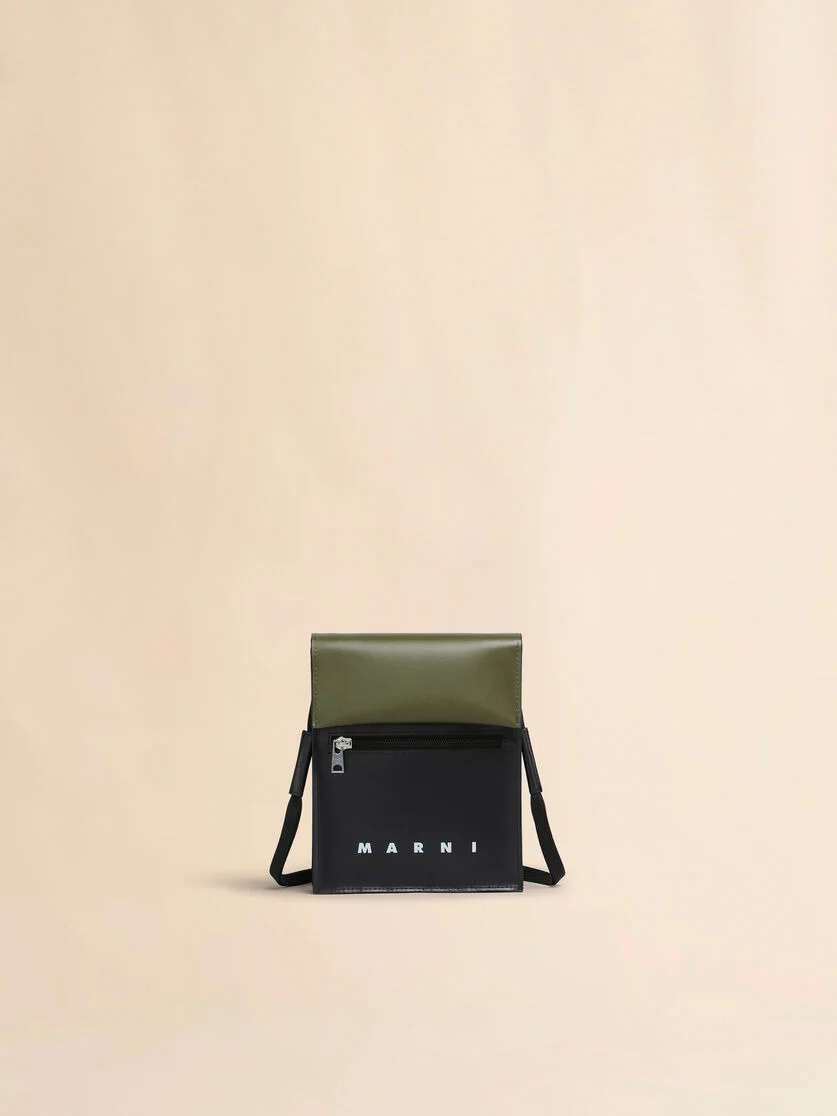 Pouch with sleek, modern silhouette and colour-block design. Shoelace-style shoulder strap. Snap button flap closure. Front zip pocket and Marni logo print. Unlined. Made in Italy MODEL SBMQ0036A5P5769ZO955 COMPOSITION Body: 100% Polyester - Coating: 100% Polyurethane - Contrast: 100% Polyester - Inside: 100% Polyurethane - Inside: 100% Polyester - Metallic Parts: 100% Steel - Metallic Parts: 100% Brass