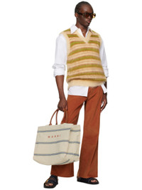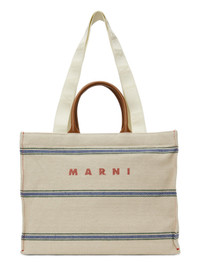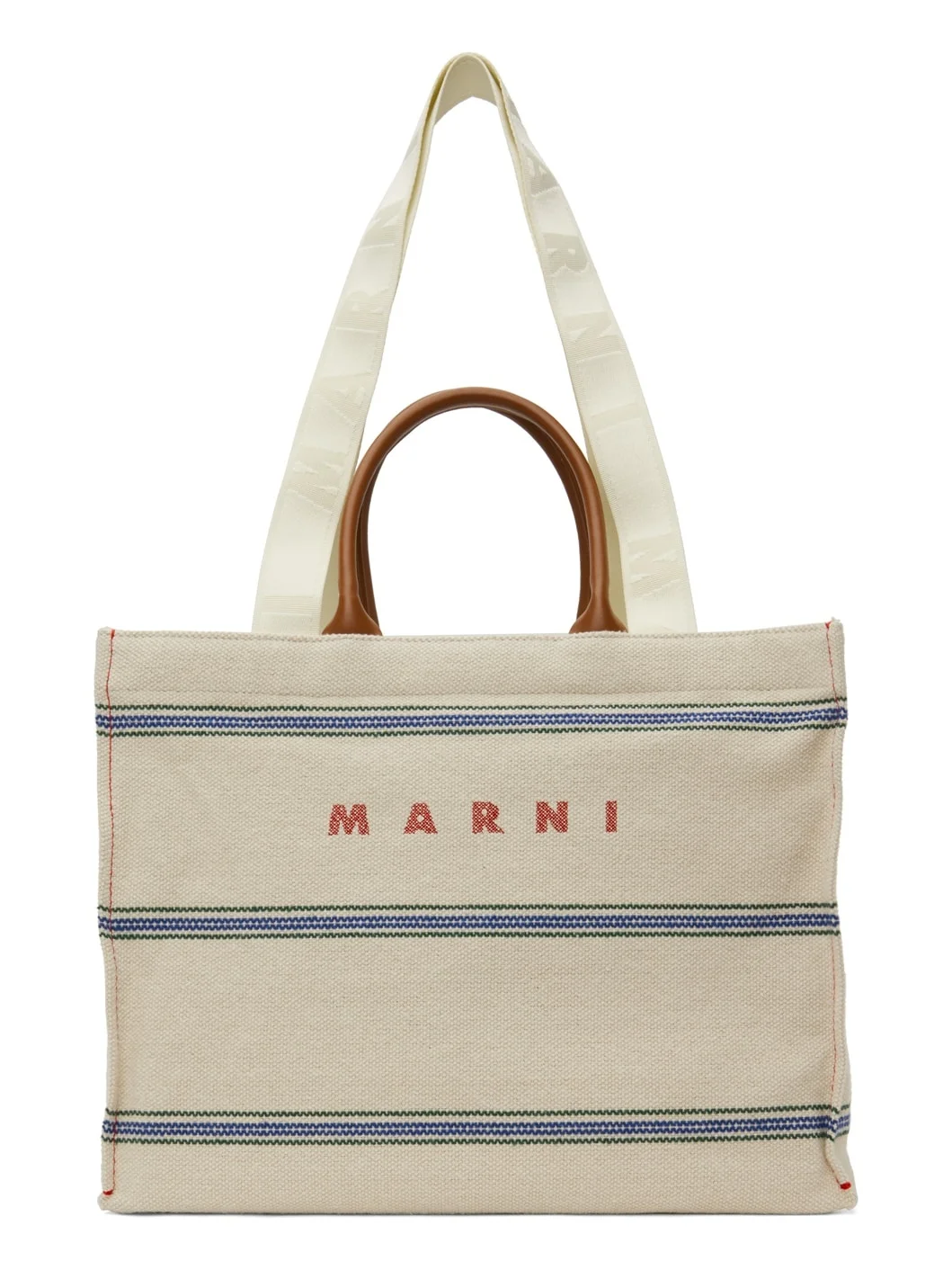 Hopsack tote in off-white. · Buffed calfskin trim and stripes throughout · Twin rolled carry handles · Twin logo-woven webbing shoulder straps · Jacquard logo at face · Zip pocket at interior · Unlined · H13" x W16" x D8" · Total height: H21.5" Supplier color: Natural/Moka