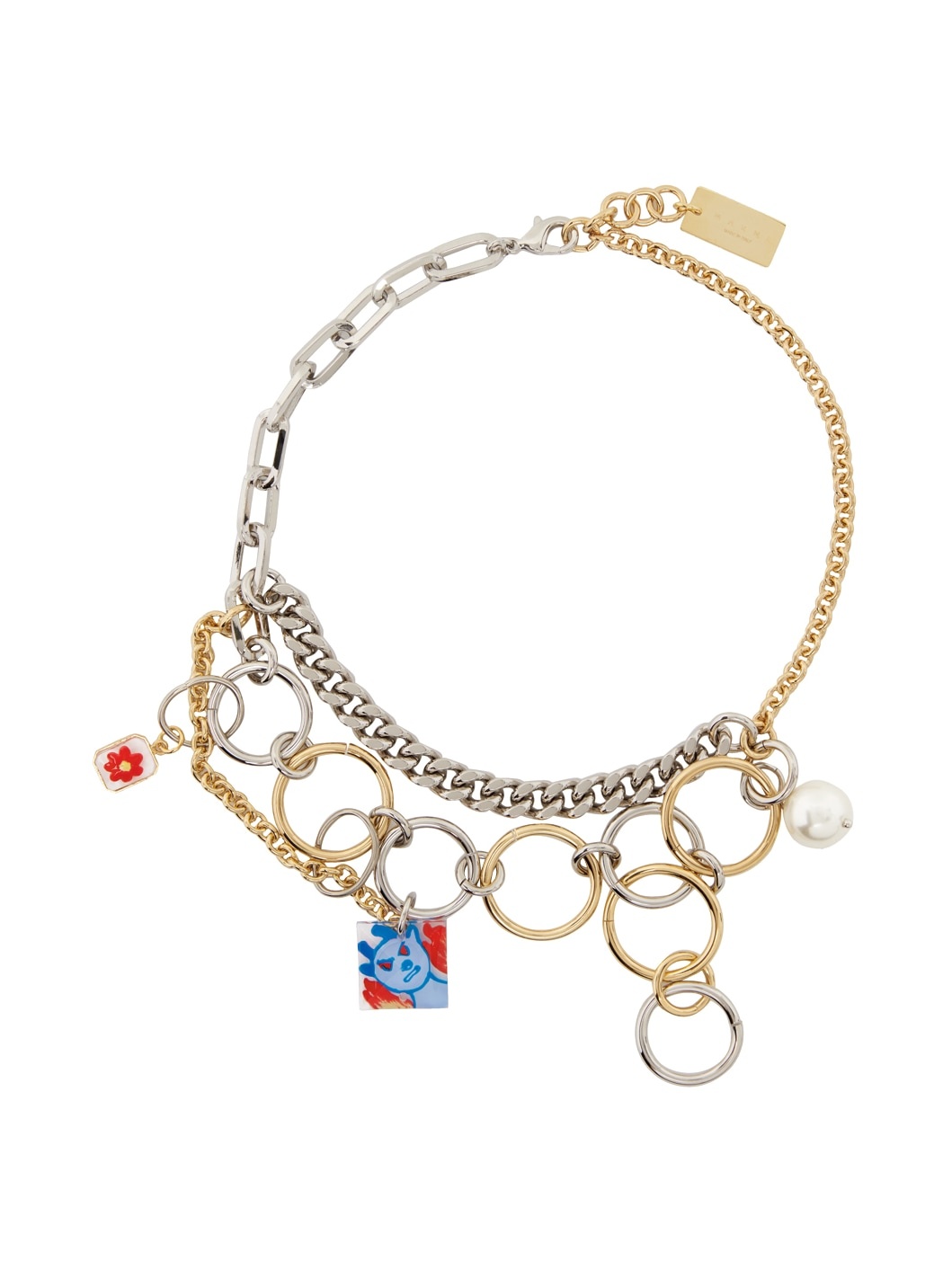 Tiered cable chain and curb chain in silver-tone and gold-tone brass. · Hand-painted graphic charms in multicolor at length · Logo plaque at adjustable lobster-clasp fastening · L15.5" Supplier color: Gold/Silver Brass, enamel, glass.