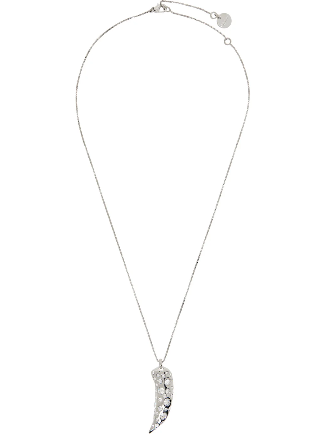 Box-chain necklace in silver-tone brass. · Graphic pendant with glass stones · Logo plaque at adjustable lobster-clasp fastening · L24" Supplier color: Palladium Brass, glass. Made in Italy 252379M145019