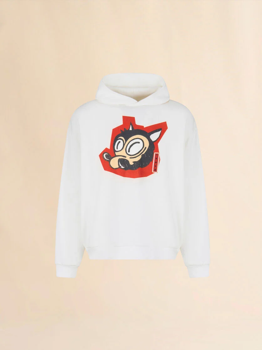 Cotton jersey hoodie. Oversized fit with ribbed cuffs and hem. Embellished with a cartoon-style wolf print on the chest and a small Marni patch. Part of the Artists' Wardrobe: a selection spanning statement pieces and everyday essentials, drawing inspiration from the works of artists Slawn and Soldier. Made in Italy MODEL FUMU0067PTUSCY40PRW01