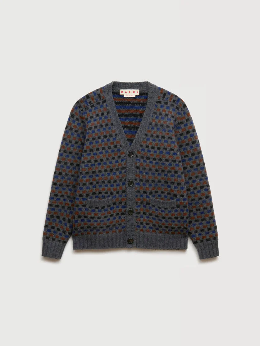 GRAY AND BLUE SHETLAND WOOL JACQUARD CARDIGAN