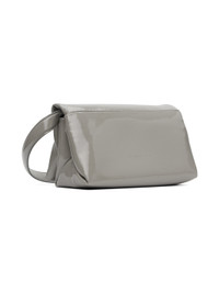 Padded patent faux-leather messenger bag in gray. · Detachable shoulder strap · Logo embossed at back face · Foldover flap · Zip pocket at two-compartment interior · Grained faux-leather lining · Logo-engraved gold-tone hardware · H4.5 x W8 x D4 in Supplier color: Stone Synthetic. Made in Italy 232379M170025