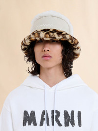 Bucket hat in leather with curly shearling trims. Peak in shaved shearling printed with an animalier pattern. Detailed with a handcrafted Marni Mending embroidery on the front. Made in Italy MODEL CLZC0110S0ULM10100W03 COMPOSITION 100% PAG