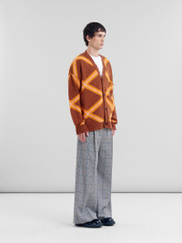 Cosy long-sleeved cardigan knitted from virgin wool. Embellished with a maxi intarsia argyle pattern. Featuring nibbled edges for a dishevelled look and a hand-stitched Marni mending logo on the back neck. Regular fit with V-neck, button closure and ribbed trims. Made in Italy MODEL CDMG0134Q0UFH946ARM36 FIT The model is 6' 1". The model is wearing size 48 IT. COMPOSITION Primary Fabric: 100% Virgin Wool Knit