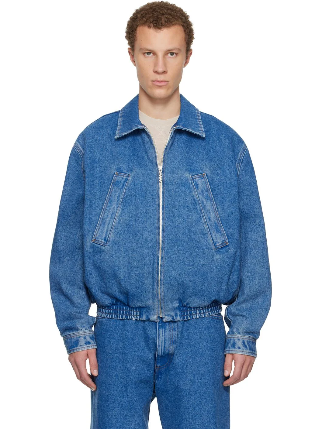 Non-stretch denim jacket. · Fading throughout · Spread collar · Zip closure · Welt pockets at front · Gathering at elasticized hem · Seam pockets · Buttoned barrel cuffs · Logo bonded at back · Contrast stitching in tan Supplier color: Ocean 100% cotton. Made in Italy 252379M177000