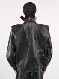 MARNI shirt in black, paneled faux leather construction, stand collar, collar self-tie scarf detailing, flap shoulders & structuring, shoulder signature hand-stitching, long sleeves, button cuffs, front vent, curved hem, oversized fit. Made in Italy Leather: 100% PVC Application: 100% Alginate Italian Sizing Model is 6'1" wearing size 50. Shoulders: 18" Chest: 36" Waist: 30"