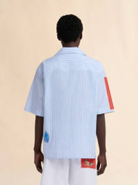 Short-sleeved bowling shirt made from striped cotton poplin. Embellished with prints and patches that embody creativity and individuality. Hand-embroidered Marni Mending. Boxy fit with straight-cut hem and button closure. Can be worn with a bowling collar or fully buttoned up. Part of the Artists' Wardrobe: a selection spanning statement pieces and everyday essentials, drawing inspiration from the works of artists Slawn and Soldier. Made in Italy MODEL CUMU0294SXUSCY37STB50