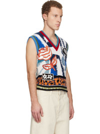 Knit virgin wool vest. · Intarsia graphic pattern throughout · Stripes at rib-knit V-neck, hem, and armscyes · Silk velvet graphic patches at front · Knit logo patch at back collar Supplier color: Ocean Body: 100% virgin wool. Trim: 100% silk. Made in Italy 252379M206002