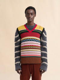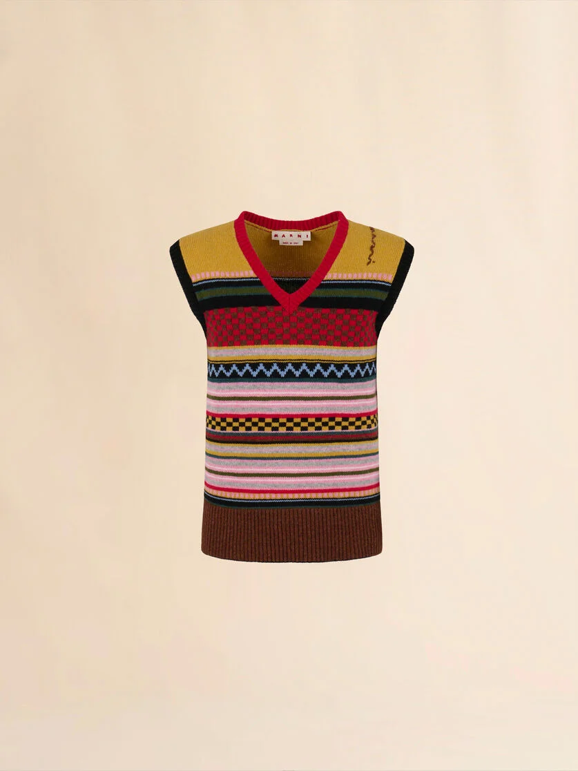 Sleeveless sweater knitted from a blend of Shetland wool and carded wool, featuring an eclectic mix of patterns in playful colours. Regular fit with V-neck and wide ribbed hem. Hand-embroidered Marni Symbol on the shoulder. Made in Italy MODEL CVMG0144Q0UFWH93MXR71 FIT The model is 6' 1". The model is wearing size 48 IT. COMPOSITION Primary Fabric: 100% Virgin Wool Knit - Secondary Fabric: 100% Virgin Wool Knit - Third Fabric: 100% Cotton Knit