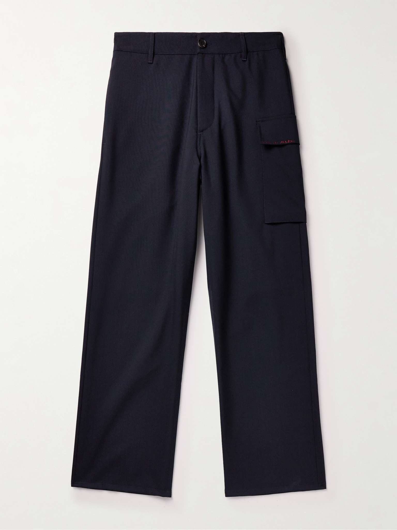Marni's straight-leg trousers are tailored from "tropical" virgin wool, which is prized for how breathable it is, making this pair ideal for year-round wear. They have a single cargo-inspired pocket at the hip that's embroidered with the brand's logo in red threads. You'll find the 'Blue Black' colourway is quite versatile. Size & Fit - Fits true to size. Take your normal size - Relaxed-straight leg, low-crotch style - Lightweight, non-stretchy fabric - Model is shown wearing an IT 48 - Model measures: waist size 32, height 6'1"/ 185cm Details & Care - Midnight-blue virgin wool - Button fastenings - 100% virgin wool; buttons: 100% horn (Buffalo); pocket lining: 69% cotton, 31% polyamide - Dry clean - Designer colour: Blue Black