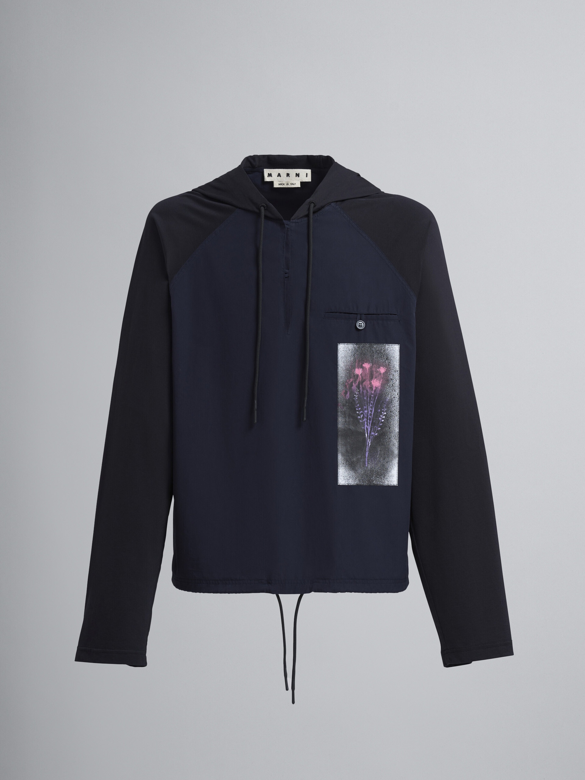 Organic compact poplin shirt; drawstring hood and hem; deep V-neck; mother-of-pearl buttons; chest welt pocket; printed bouquet patch; made in Italy. DETAILS COMPOSITION Primary Fabric: 100% Cotton Woven - Secondary Fabric: 100% Cotton Knit CARE INSTRUCTION Wash at 30° C - Delicate cycle. Do not bleach. Low iron. Do not dry clean. Do not tumble dry.