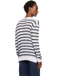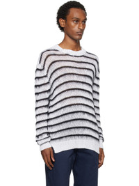 Open knit cotton sweater. Jacquard brushed knit mohair-blend stripes throughout. · Rib knit crewneck, hem, and cuffs · Dropped shoulders · Intarsia logo at back Supplier color: Lily white Body 1: 100% cotton. Body 2: 67% mohair, 28% polyamide, 5% wool. Made in Italy 241379M201001