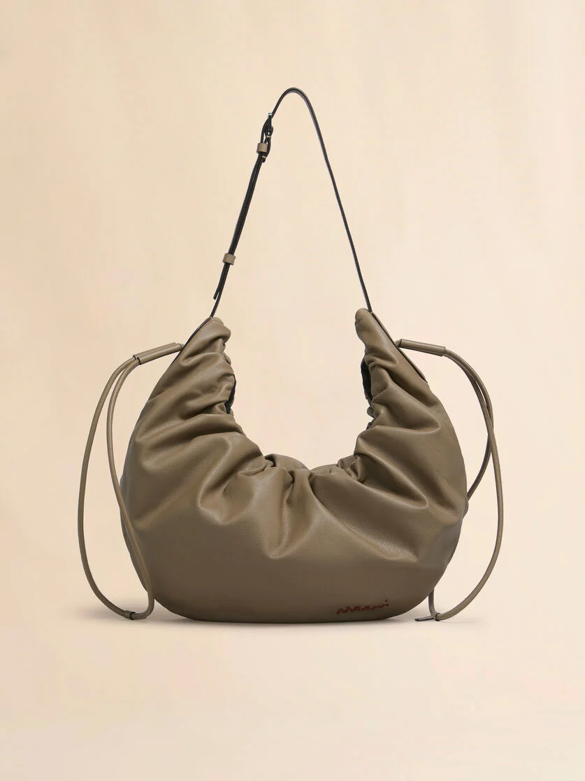 Scrunchie hobo bag made from calfskin leather. Small size. Adjustable side drawstrings without rivets for a graceful draped look. Adjustable shoulder strap. Concealed magnetic closure and technical fabric lining. Hand-embroidered Marni Mending logo in contrast leather. Made in Italy MODEL SBMQ0115U0P854800N42