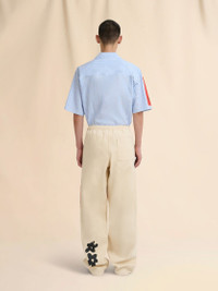 Organic bull denim trousers, featuring an elasticated waist with inner drawstring. Embellished with prints and patches that embody creativity and individuality. Hand-embroidered Marni Mending and Marni Symbol. Regular fit. Part of the Artists’ Capsule Collection: an exclusive collab between Creative Director Francesco Risso and artists Soldier Boyfriend and Olaolu Slawn. Made in Italy MODEL PUMU0315SXUSCY3800W08