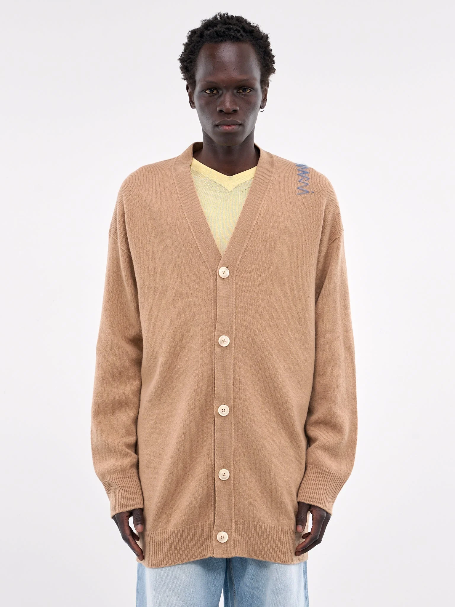 MARNI cardigan in beige, paneled wool knit construction, rib-knit, v-neckline, shoulder signature hand-stitching, front button placket closure, long sleeves, rib-knit cuffs & hem, straight hem, relaxed fit. Made in Italy 100% Virgin Wool European Sizing Model is 5'11.5" wearing size 48. Shoulders: 16" Chest: 32.5" Waist: 30"
