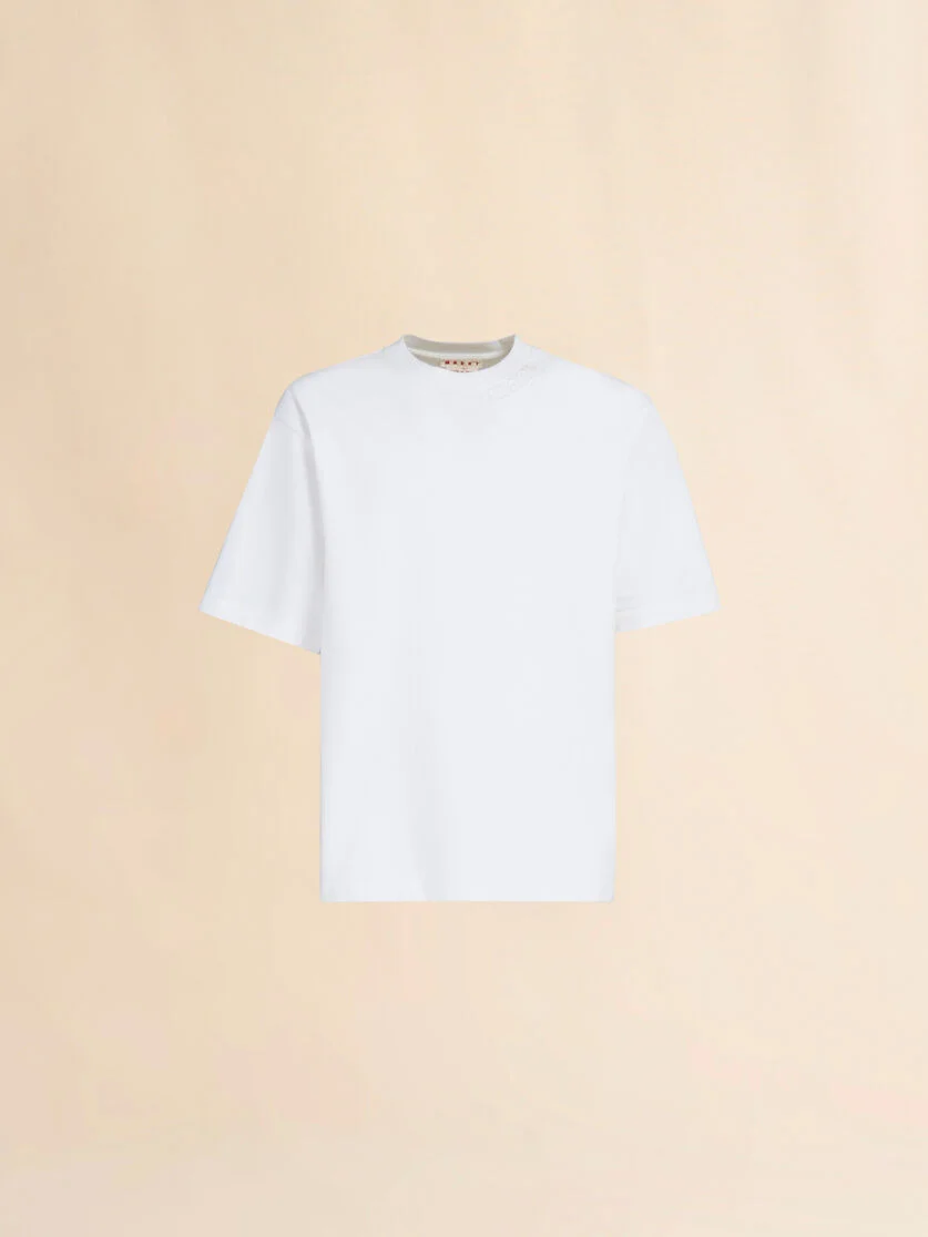 Short-sleeved crew-neck T-shirt made from organic cotton jersey. Oversized fit. Tonal Marni patches along the neckline. Made in Italy MODEL HUMU0287X0UTC32300W01 COMPOSITION 100% CO2