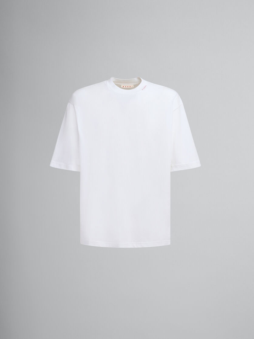 Short-sleeved crewneck T-shirt in organic jersey cotton. Boxy fit. Embellished with a hand embroidered Marni Symbol on the collar. MODEL HUMU0223X5UTCZ6800W01 FIT The model is 6' 1". The model is wearing size 48 IT. COMPOSITION Primary Fabric: 100% Cotton Knit