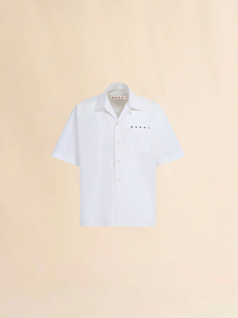 Short-sleeved bowling shirt made from organic cotton poplin. Detailed with a Marni logo poking out from behind the chest pocket. Boxy fit with straight-cut hem and mother-of-pearl button closure. Can be worn with a bowling collar or fully buttoned up. MODEL CUMU0213P8USCT88LOW01 FIT The model is 6' 1". The model is wearing size 48 IT. COMPOSITION Primary Fabric: 100% Cotton Woven