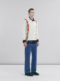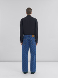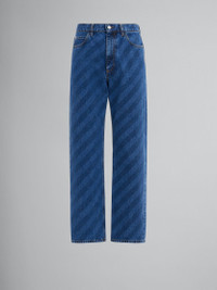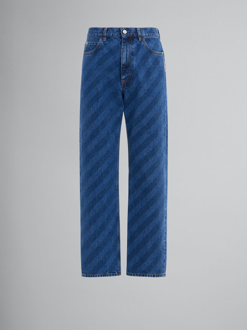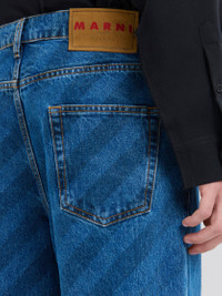 Bleached 5-pocket jeans with diagonal striped pattern. Relaxed fit with regular waist and wide leg. Zip and tack button closure. Finished with a leather label with red Marni print at the back of the waist, and metallic Marni writing on the side. Made in Italy MODEL PUJU0021A0USCX36STB95 FIT The model is 6' 2". The model is wearing size 32 IT. COMPOSITION Primary Fabric: 100% Cotton Woven - Pocket Lining: 65% Polyester Woven 35% Cotton Woven - Application: 100% Calf Leather