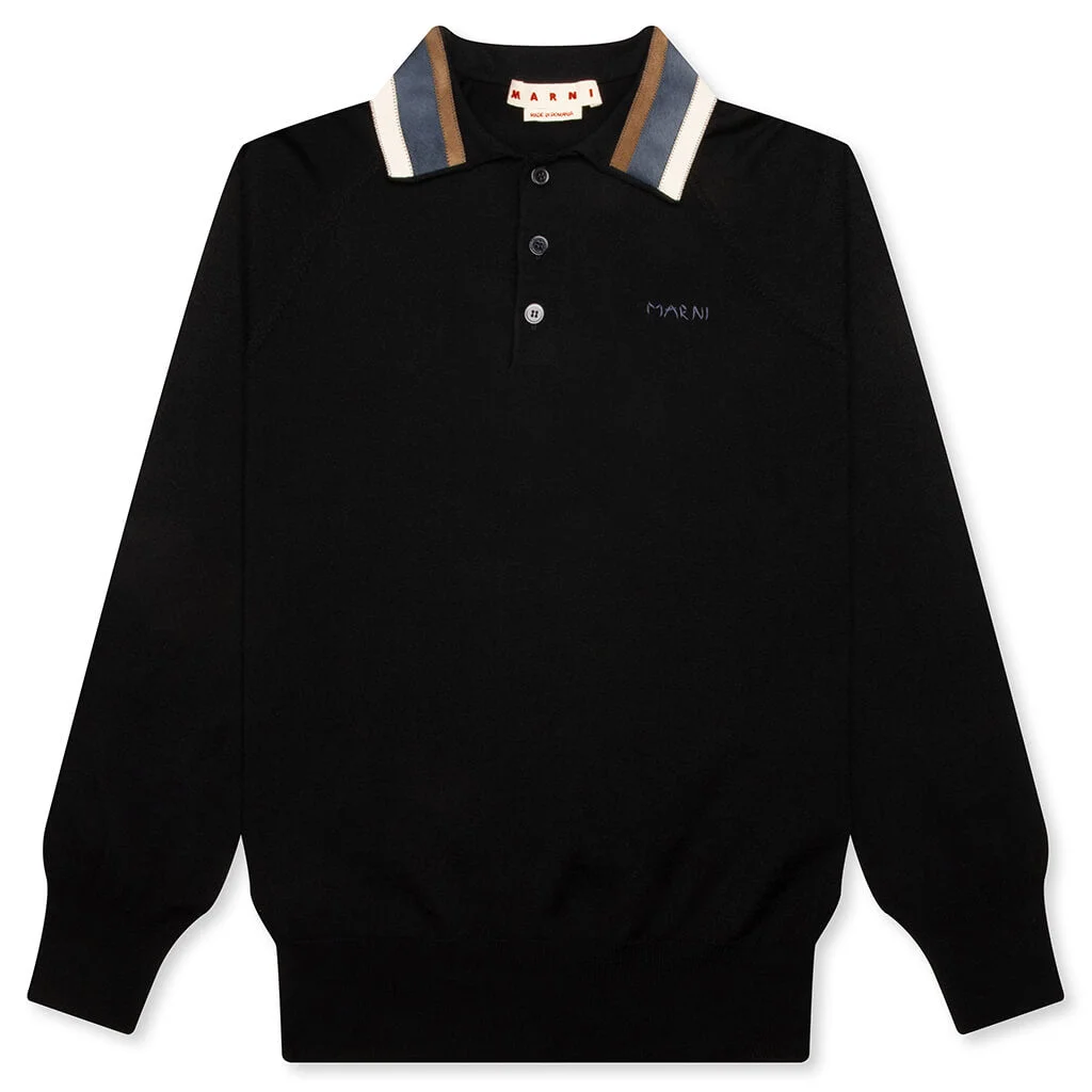 Marni's craftsmanship shines through in the Light Wool With Patchwork Gauge Polo. Crafted from virgin wool, the collar is appliqued with ovine leather, cattle hair, and calf leather for standout details. The button placket, raglan sleeves, and ribbed knit trims keep the piece timeless. Finished with signature Marni embroidery. - 100% Virgin Wool - Applique: Ovine Leather, Cattle Hair, Calf Leather - Spread collar - Button placket - Raglan sleeves - Marni embroidery - Ribbed knit trims - Style No: POMG0086NQ UFW621 00N99