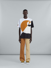 MARNI x CARHARTT WIP colour-block trousers. Patchwork design made from washed bio cotton canvas and cotton corduroy. Heart-shaped button and zip fly, styled with side pockets and rear buttoned welt pockets. Branded with a back Carhartt Work In Progress logo patch and "MARNI" lettering. DETAILS COMPOSITION Primary Fabric: 100% Cotton Woven