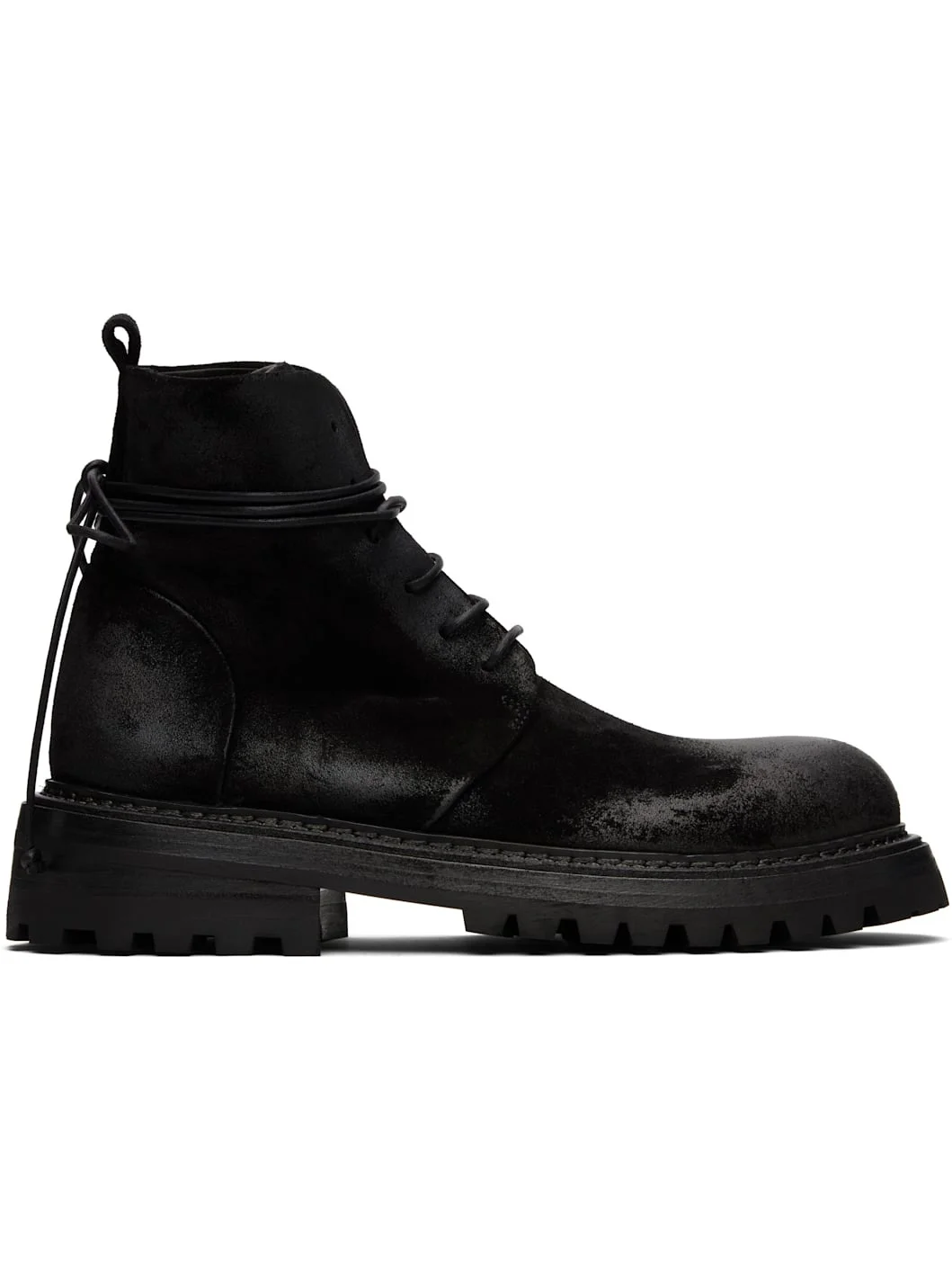 Ankle-high suede boots. · Lace-up closure · Pull-loop at heel collar · Buffed leather lining · Topstitching at welt · Stacked leather and rubber heel and midsole · Treaded rubber sole Supplier color: Black Upper: leather. Sole: rubber. Made in Italy 252349M255012