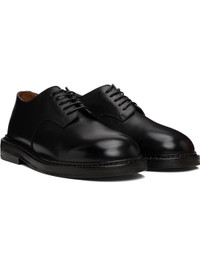 Buffed leather derbys in black. · Lace-up closure · Topstitching at welt · Stacked leather heel with rubber injection · Leather sole Supplier color: Black Upper: leather. Sole: leather, rubber. Made in Italy 252349M225007