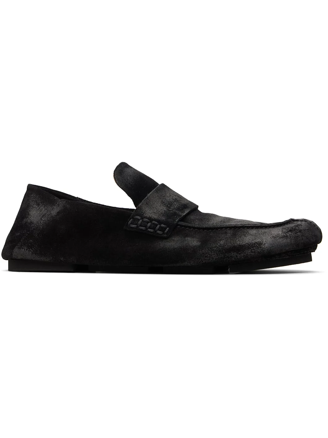 Calfskin suede loafers. · Smudging throughout · Moc toe · Strap at vamp · Collapsible heel counter · Leather lining · Treaded rubber sole Supplier color: Black Upper: calfskin. Sole: rubber. Made in Italy 261349M225002
